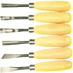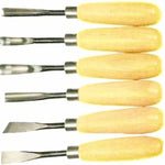 Set de 6 gubias que incluye modelos rectos, curvos y en V. Diseñadas para trabajos de talla en madera con precisión y control.