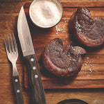 Juego de 4 piezas para asado con estuche, color castaño. Ideal para regalos, con diseño rústico y elegante.