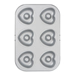 Molde con 6 cavidades en forma de donut con corazón central. Ideal para postres románticos, donuts horneados o preparaciones saludables sin fritura.