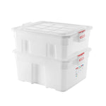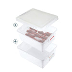 El Kit de Descongelación de 70 litros de Araven está diseñado para procesos de descongelación de grandes volúmenes. Consta de tres piezas: una cubeta perforada que permite que el líquido resultante drene, una cubeta inferior que recoge el exudado y una tapa que protege el alimento de contaminaciones externas.