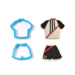 Este set temático incluye dos cortadores en forma de camiseta y short de fútbol, para personalizar galletas para aficionados o eventos deportivos.