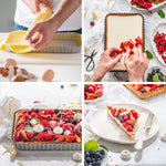 Molde rectangular con base desmontable y recubrimiento antiadherente para facilitar el desmolde sin dañar la tarta. Perfecto para repostería dulce y salada.
