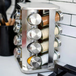 Organiza tus condimentos con el especiero giratorio Simplit de 16 frascos. Su estructura metálica con acabado moderno permite girar suavemente para un acceso rápido a todas tus especias. Los frascos de vidrio transparente cuentan con tapa metálica roscada que mantiene el contenido fresco por más tiempo.