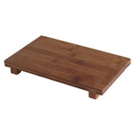 Tabla rectangular de bambú con patas elevadas para servir quesos, fiambres o bocadillos. Su altura permite presentaciones elegantes en mesas o bandejas.